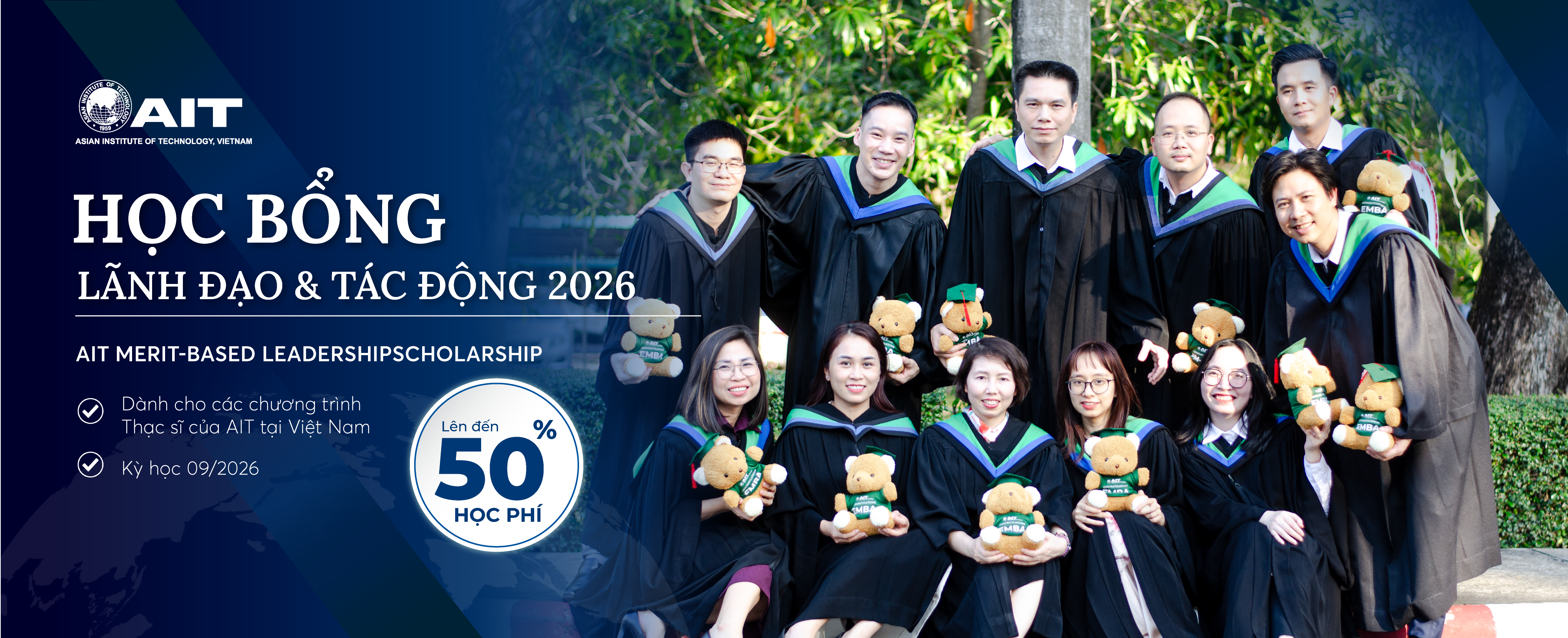 * AIT Việt Nam trao Học bổng Lãnh đạo & Tác động 2026 lên đến 50% học phí cho các chương trình Thạc sĩ quốc tế của AIT triển khai tại Việt Nam.